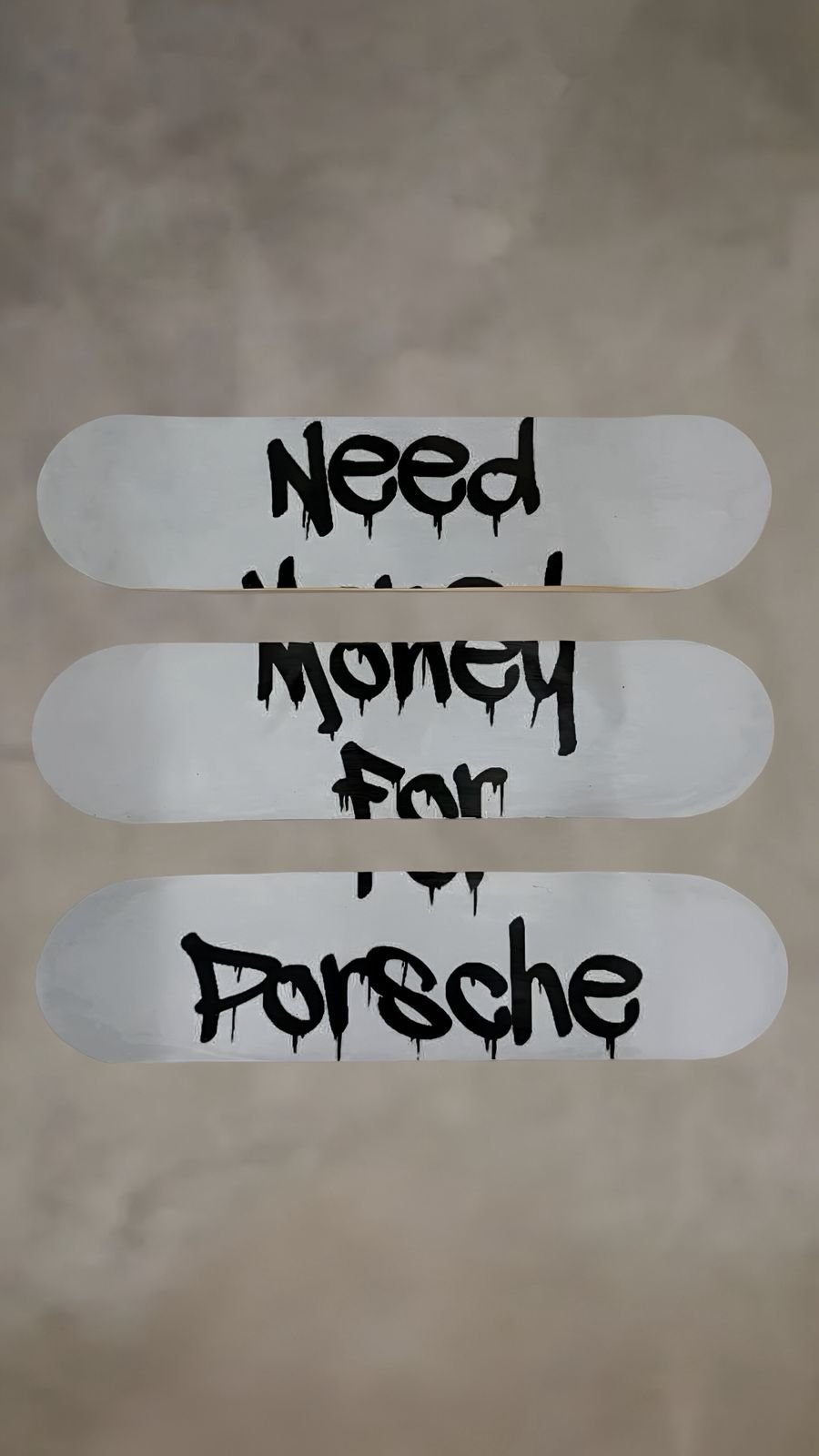 The NeedMoney Porsche Trilogy is a bold, high-end art collection consisting of three hand-painted skateboards that together form a powerful, dripping street manifesto: “Need Money For Porsche”. Each deck features raw, graffiti-style black lettering with signature drip effects on a clean white background, creating a cohesive yet individually striking visual narrative. The imperfect, rebellious typography captures the unapologetic hustle and luxury aspiration of urban culture. Crafted as limited-edition collector pieces, this triptych is perfect for wall display as a statement installation, appealing to street art lovers, car enthusiasts, and those who appreciate provocative, money-driven aesthetics in contemporary art.